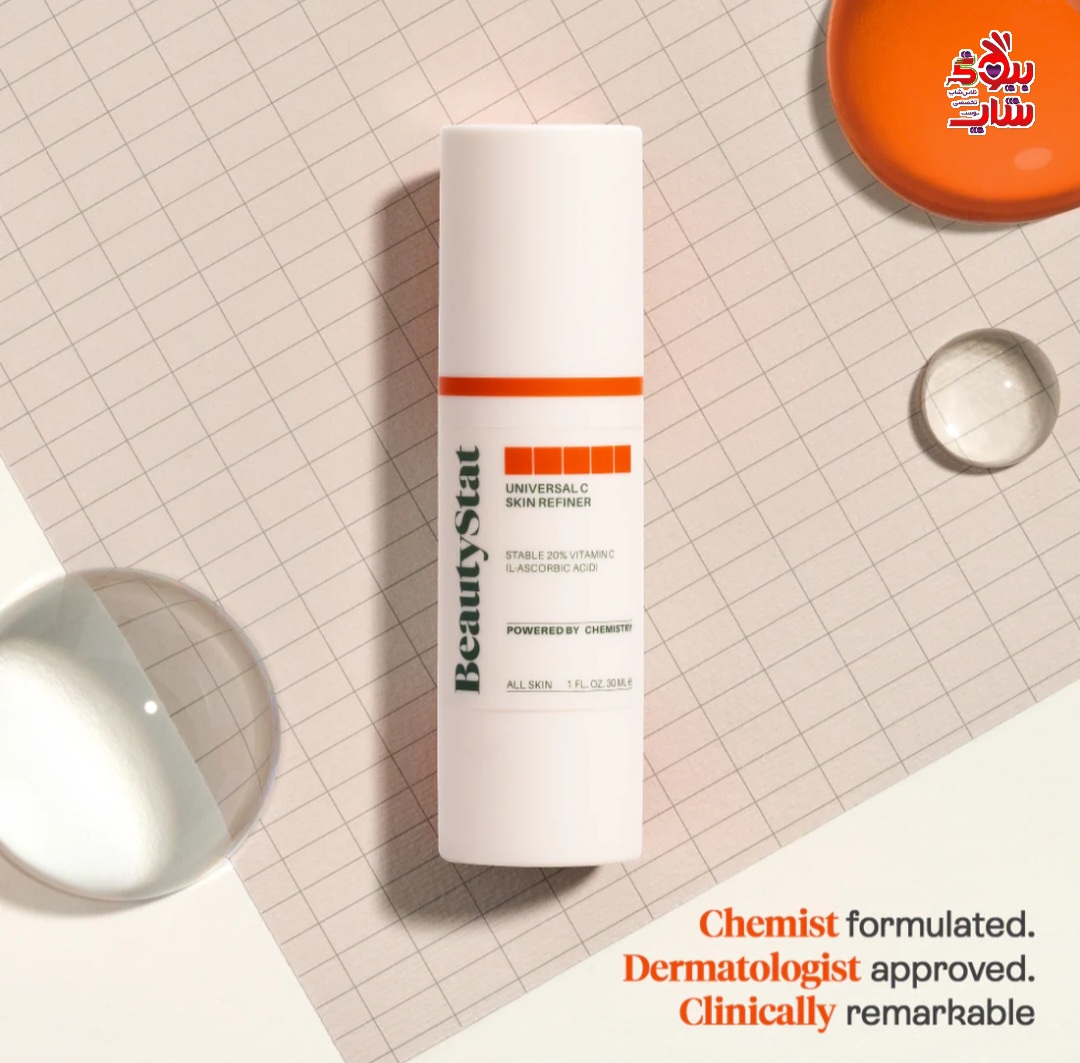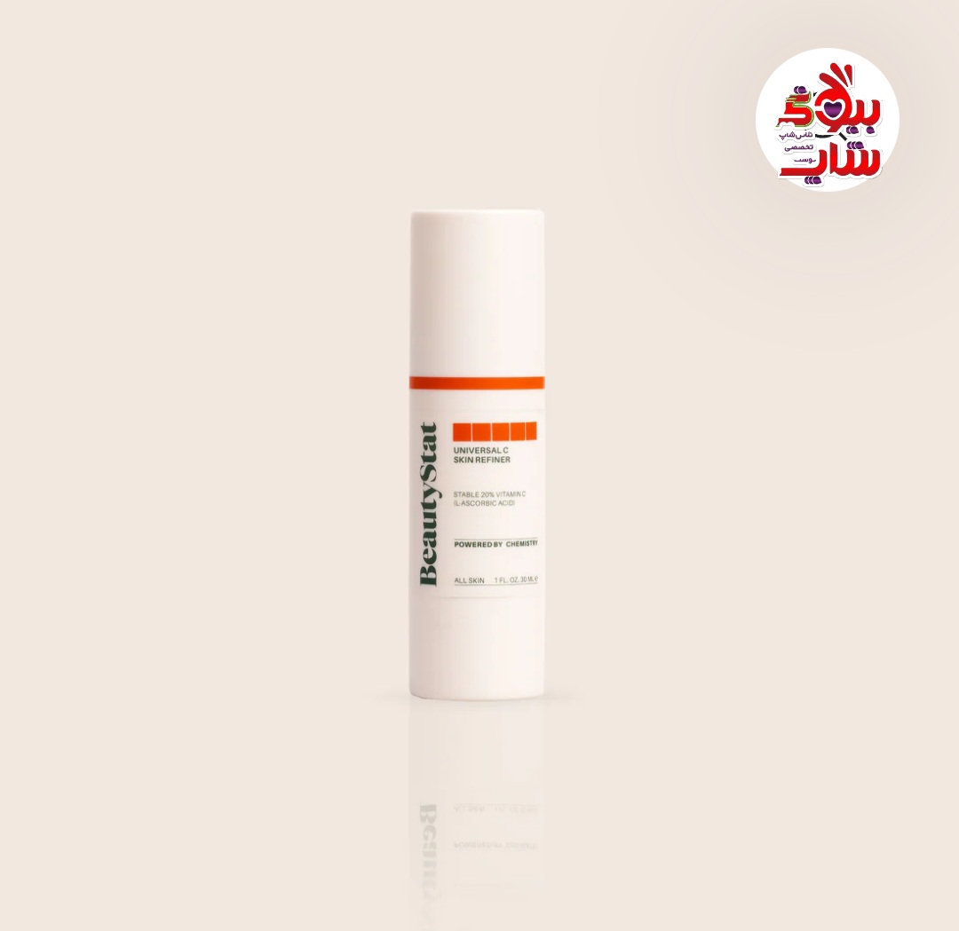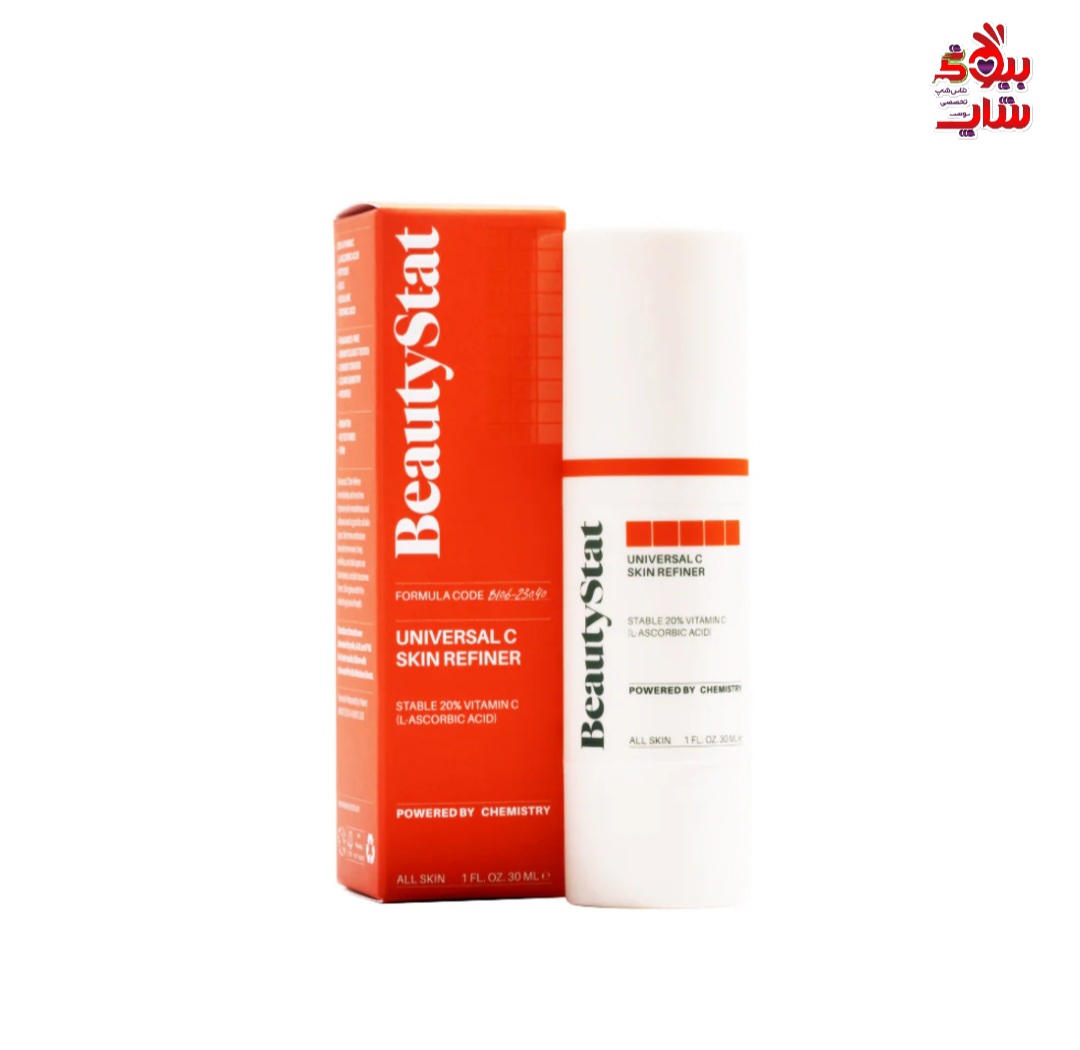 WHAT IT IS? The BeautyStat masters of innovation in Vitamin C, helmed by Ron Robinson, have translated their pure and stable 20% L- Ascorbic acid into a groundbreaking new category they call "Brightenaging"- where advanced brightening meets powerful anti- aging action. Introducing our next-gen Universal C Skin Refiner, now supercharged with a synchronistic combination of peptides that amplifies rejuvenation benefits with our Chem-C" Technology. Our dual-action formula of triple-patented one-of-a-kind Vitamin C unites with r powerful peptides *O strengthen our formulation, delivering improved firming and smoothing benefits while our signature 20% pure L-Ascorbic acid targets stubborn dark spots, uneven tone, and hyperpigmentation. Innovative hyaluronic acid powder creates an instant plumping effect on skin's surface, working inharmony with our enriched chemistry of ceramides andpomegranate sterols tohelp soothe and comfort the skin barrier, optimally balancing our active and potent concentration of vitamin Experience our most advanced formulation yet: dramatically even, brightened skin that appears lifted, plump, and firm with continued use.