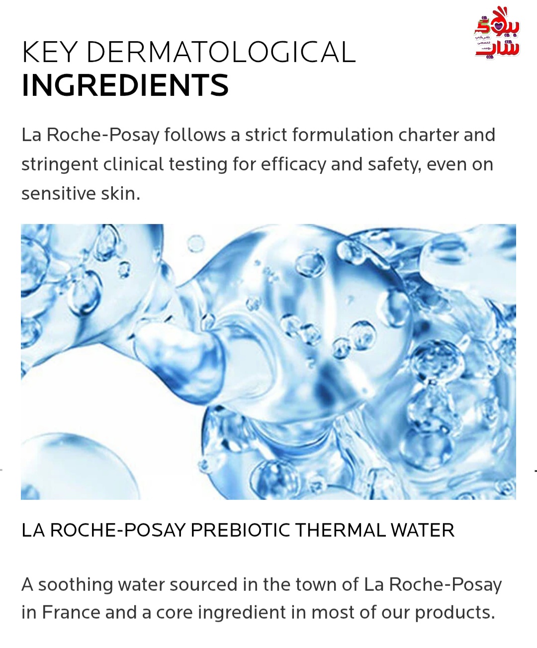 Dimethicone: A silicone-based polymer used as a skin protectant to help reduce water loss. La Roche-Posay Prebiotic Thermal Water: A soothing water sourced in ne town of La Roche-Posay in France and a core ingredient in most of our products. It contains a unique combination of minerals, trace elements, and a high concentration of selenium, a natural antioxidant.