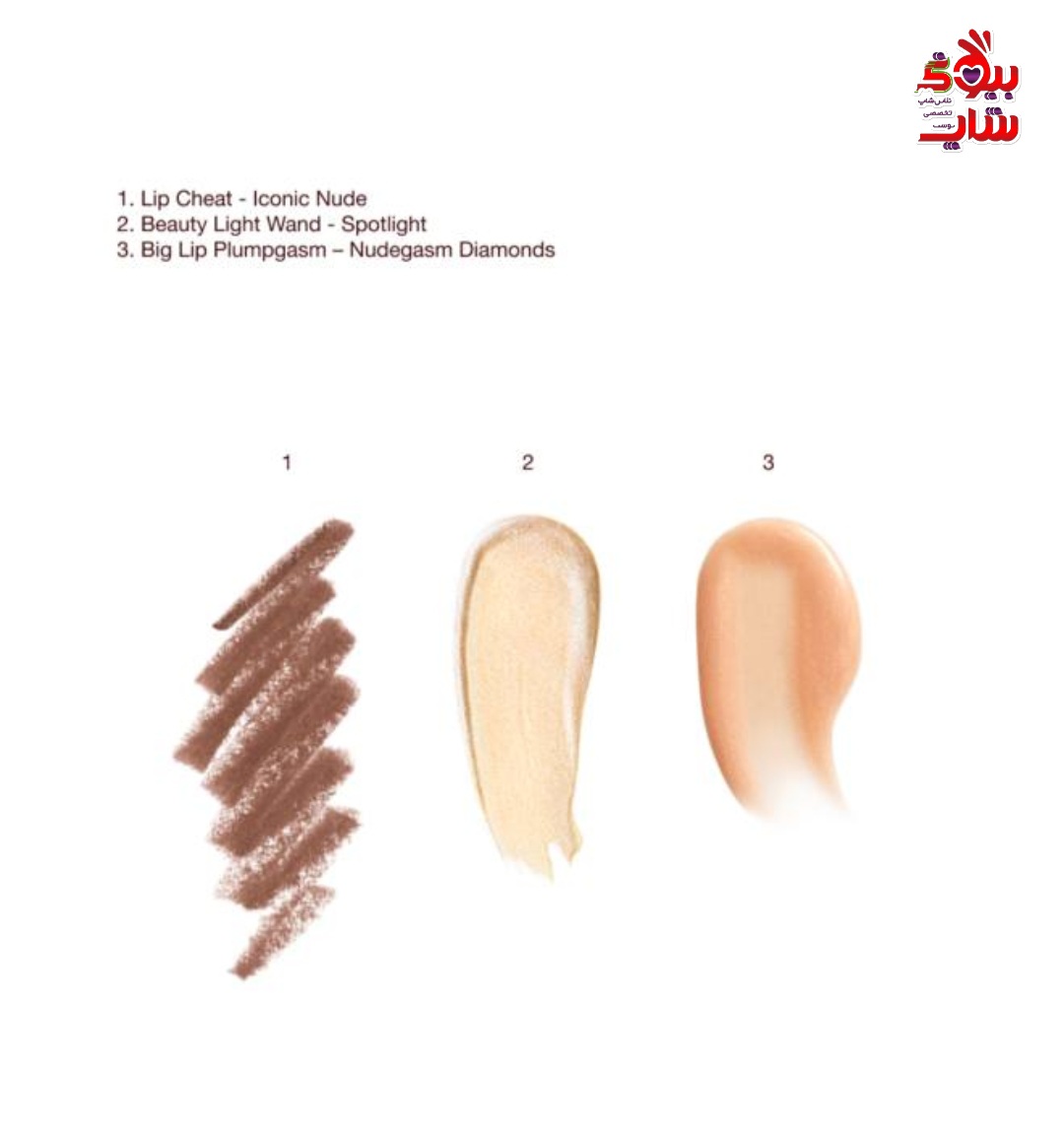 This kit includes my Iconic Nude Lip Cheat ta line + define your lips, Big Lip Plumpgasm in Nudegasm Diamonds for a supersized, glossy glazed pout and my world-famous Spotlight Beauty Light Wand to give you that superstar spotlit glow!