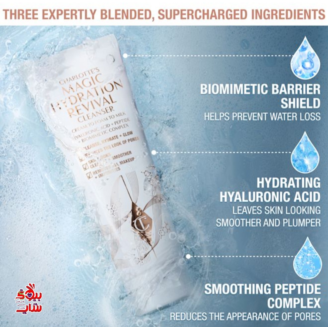 nspired by the effects of a world-class facial this 3-in-1 cleanser bathes your skin in revitalising hydration and reduces the look of pores! Made with three expertly blended supercharged ingredients including Hyaluronic Acid and powerful Peptides, use Charlotte's Magic Hydration Revival Cleanser each morning and night to deeply cleanse and remove makeup, while intensely hydrating your complexion!