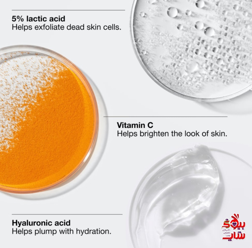 At the core of its composition is 5% lactic acid. Recognised for its refining abilities, the naredient eliminates dulling dead skin cells This radiance-enhancing effect is amplified by vitamin C. Meanwhile, hvaluronic acid delivers an intense boost of moisture