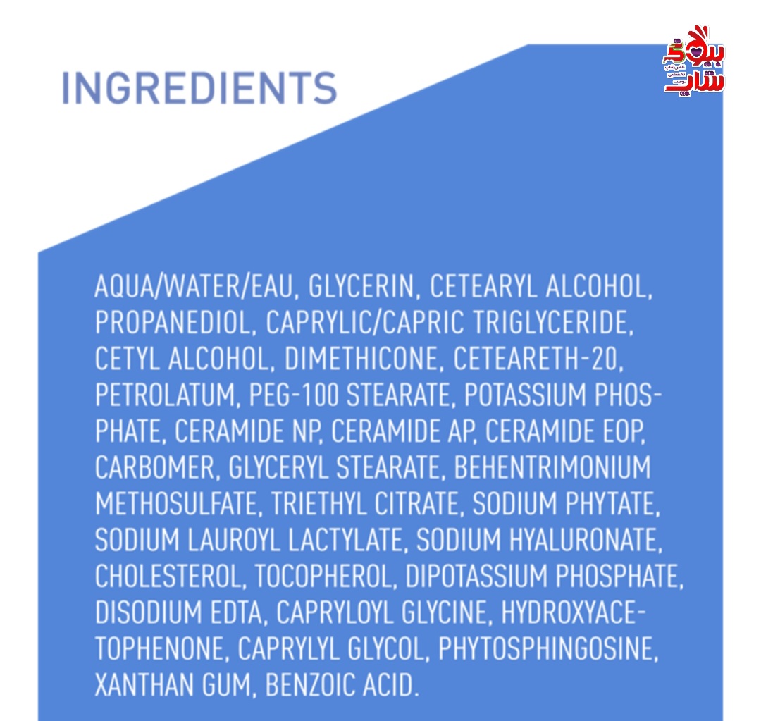 INGREDIENTS: AQUA/ WATER/ EAU, GLYCERIN, CETEARYL ALCOHOL, CAPRYLIC/CAPRIC TRIGLYCERIDE, CETYL ALCOHOL, CETEARETH-20, DIMETHICONE, PE TROLATUM, POTASSIUM PHOSPHATE, CERAMIDE NP,_CERA MIDE AP, CERAMIDE EOP, CARBOMER, BEHENTRIMONIUM METHOSULFATE, SODIUM LAUROYL LACTYLATE, SODIUM HYALURONATE, CHOLESTEROL, PHENOXYETHANOL, DIPOTASSIUM PHOSPHATE, DISODIUM EDTA, PHYTOSPHINGOSINE, XANTHAN